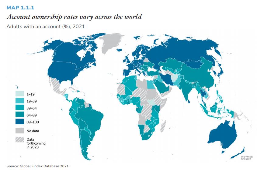 - to, Worldwide, account ownership increased by 50 percent in the 10 years spanning 2011 to 2021, to reach 76 percent of the global adult population.