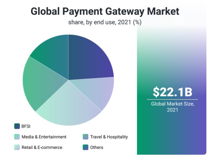 In 2021, the global payment gateway market size was valued at $22.09 billion USD, and is expected to expand at a compound annual growth rate (CAGR) of 22.1% from 2022 to 20301.